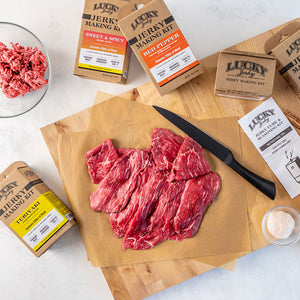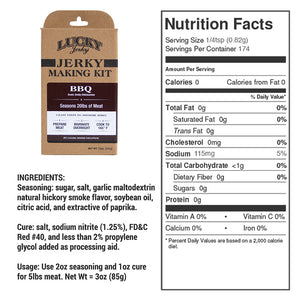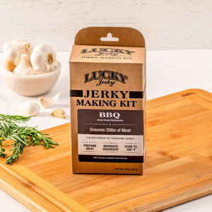If you like BBQ, you’re going to love our new BBQ flavor Lucky Beef Jerky DIY Jerky making kit. It is a traditional smoky BBQ flavor with just the right blend of sweet & salty. The kit includes all the seasoning and cure necessary for 20 lbs of jerky. Great for venison, beef, fowl, or pork.Homemade beef jerky is a much more healthy treat than chocolate chip cookies and it’s more fun to make. Lucky Beef Jerky “Seasoning and Cure Kits” are easy to use and make a great project for the whole family. The hard work is all taken care of, we designed it into the kits so there is no complicated measuring or weighing of cure. Simply dissolve 1 packet of cure and 1 packet of seasoning into 1 cup of cold water to create a marinade that will cure 5 lbs of lean meat. The kit works equally well for “slab style” jerky or “ground and formed” jerky. If you’re making slab jerky, simply slice 5 lbs of lean meat as consistently as possible and 3/8” thick or thinner, then combine it with the marinade in a zip lock bag and refrigerate for 24 - 36 hours. If you’re making ground and formed jerky, simply mix the marinade with 5 lbs of lean, ground beef until the mixture becomes very sticky, then extrude onto drying racks and cook per the instructions included in the kit.