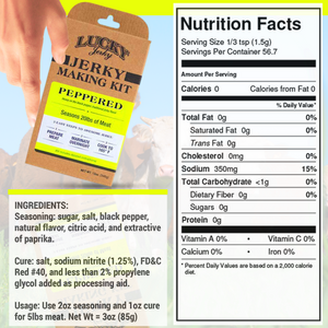 Making jerky at home is one of the fastest growing segments in the outdoor market. Folks are beginning to realize just how easy it is to make great tasting long lasting jerky on their own. Our kits make it even easier. We spent a lot of time thinking about how to simplify the jerky making process as much as humanly possible and we believe we’ve created a winner. The kit will make both slab style jerky and ground and formed jerky. Both styles of jerky start the same way; simply dissolve 1 packet of cure and 1 packet of seasoning into 1 cup of cold water. The marinade that is created is then added to 5 lbs of lean meat. If making slab jerky, allow the meat to soak in the marinade for 24 - 36 hours. If you are making ground and formed jerky, mix the marinade into the ground meat until the mixture becomes very sticky, then extrude the mixture onto a drying rack and cook per the instructions. Black Pepper flavor is a bold flavor with notes of garlic and onion. It is designed to accent the flavor of the meat on which you are using the seasoning. If you desire a stronger black pepper flavor, simply add fresh, ground black pepper to the marinade. Always season to taste.