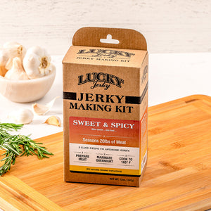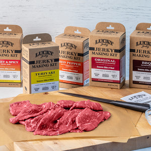 Homemade beef jerky is a much more healthy treat than chocolate chip cookies and it’s more fun to make. Lucky Beef Jerky “Seasoning and Cure Kits” are easy to use and make a great project for the whole family. The hard work is all taken care of, we designed it into the kits so there is no complicated measuring or weighing of cure. Simply dissolve 1 packet of cure and 1 packet of seasoning into 1 cup of cold water to create a marinade that will cure 5 lbs of lean meat. The kit works equally well for “slab style” jerky or “ground and formed” jerky. If you’re making slab jerky, simply slice 5 lbs of lean meat as consistently as possible and 3/8” thick or thinner, then combine it with the marinade in a zip lock bag and refrigerate for 24 - 36 hours. If you’re making ground and formed jerky, simply mix the marinade with 5 lbs of lean, ground beef until the mixture becomes very sticky, then extrude onto drying racks and cook per the instructions included in the kit.